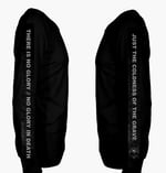 One-sided with sleeve prints. Medium gray ink on black unisex Longsleeve t-shirt.